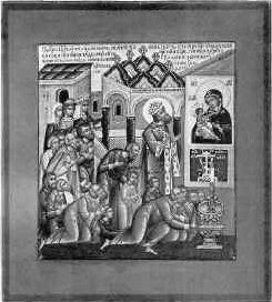 Клеймо Тихвинской иконы Божией Матери из храма Московского Преображенского кладбища. Среди молящихся изображены Царь Иоанн Васильевич с нимбом и его сыновья Федор Иоаннович и Дмитрий Иоаннович. Конец XVI века |